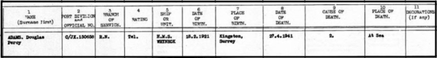 No.C/JX 150658, Telegraphist, Douglas Percy ADAMS