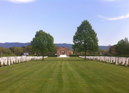 Attested for Royal Artillery in 1940. The 13th Anti Tank regiment were much travelled- France 1939-40, UK 1940-1942, India 1942, Iraq 1942-43, Syria 1943, North Africa 1943-44 and Italy from 1944. Many of the graves in Arezzo were brought in from the surrounding area. At present there is no indication of where or when Edward was wounded. |
