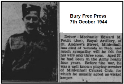 Edward Mason Pettit was born in Mildenhall on 22nd December 1906 (Mildenhall Q1-1907 4A:954a) son of Edward and Maggie Pertwee PETTIT (née WOMERSLEY). 1911 census... Aged 4 he was at High Street, Mildenhall with his father Edward PETTIT [44] baker and confectioner, born Mildenhall; his mother Maggie Pertwee [39] born Sandown, Isle of Wight; sister Dorothy Evelyn [13] born Mildenhall. There was an elder sister Elsie M [14] He married to Ivy Hatton CROUCH [29-10-1905] in Ely in 1928. In the 1939 register they were at St Andrews Street, Mildenhall, Edward was a market porter/gardener. With them were their sons Edward J. [12-6-1929] and Kenneth D [6-12-1938. Their other son must be one of the 3 closed records at that address. His widow re married in 1946 to Ronald PALMBY |