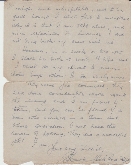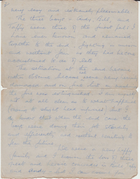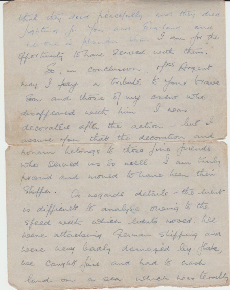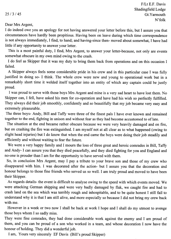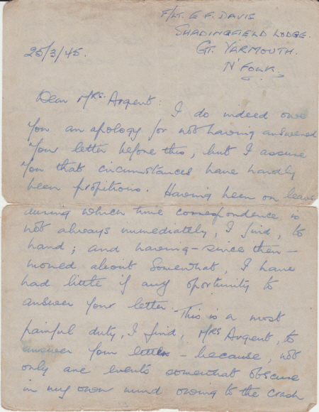 Below are images of the letter from the aircraft's pilot to Mrs Argent and transcriptions