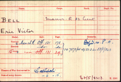 on the spot, but he died on the way to the Field Ambulance. An extract from a letter received by his father says: — "... He did excellent work all through the fighting from August 7th until he met his death. His name was, I believe, one of those sent forward for ' mention in Despatches.' Whether it will eventually appear in the lists it is difficult to say, but I thought you would like to know that his Commanding Officers appreciated his work, and thought very highly of him. Lives like his are very hard to replace." This was during the landings at Sulva Bay. This was reported in the 11th Battalion history: "On the 13th we relieved the SHERWOOD FORESTERS in fire trenches 92A, having the Indian Brigade on our right flank, and the 32nd Brigade on our left. During the night and the following day we were at work -improving the trenches. The weather was very hot, water scarce and bad, and the men suffered much from exhaustion. Lieutenant E. V. BELL was mortally wounded". A few weeks before going into action in the Dardanelles he was commissioned in the Royal Flying Corps, but his Commanding Officer persuaded him to remain in the Army. |
