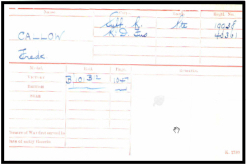 1881 census...Aged 5, he was at 10 Stamford Street, Fulham with his father William Major CALLOW [36] a fitter; his mother Eliza [32]; brothers William [9] and Charles [7]: sister Lizzie [2]; Charles WHITE [56] widower, blacksmith (? grandfather). Frederick and Lizzie were born in Fulham, the rest in Chelsea. 1891 census...Aged 14, in a coal office, he was at 36 Avalon Road, Fulham with his parents; widowed grandmother Ellen LATHAN [70]; brother Charles [17] in coal office; sisters Rose[12], Annie [6] and Alice [4].All the children recorded as born in Fulham. 1901 census...They have not been identified in this census. His father appears to have died on 1901. 1911 census...Aged 38, a groom, Frederick CALLOW, was living with his wife Betsy CALLOW [29-10-1868] (née JARVIS) at 4 Jubilee Cottages, Park Lane, Newmarket. They married in Newmarket in Q2-1902. Betsy was cook for John Huggins, a trainer in Albert Street. Their son Harold Frederick was born on 8-5-1903 , daughters Hilda Gladys (27-3-1905] and Freda Lucy [14-8-1909]. Son Harold, in 1937, married Mabel FORDHAM, in Newmarket. From the pension card is appears they had 5 children, Harold (8-5-1903), Hilda Gladys (27-3-1905), Freda Lucy(14-8-1909), Phyllis Irene (15-4-1912) and Albert Thomas (23-6-1913. The pension for ll these was a total of 32 shillings 6 pence per week (£1.62). |