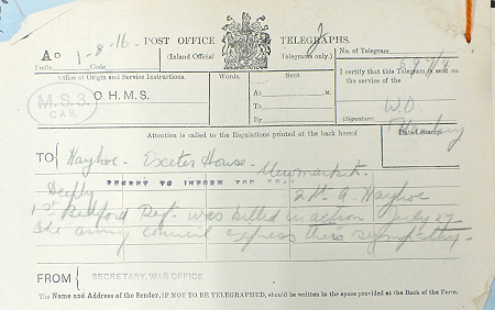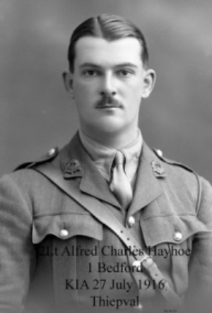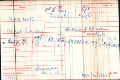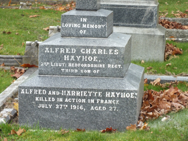 1891 census...Alfred Charles [2] was at Palace House with his father Alfred [39] racehorse trainer born Malton, Yorks; his mother Harriette [40] born Newmarket and his sisters Millicent [12]; Ethel R [11]; Eleanor E [10]; Violet M [5] and Gertrude A [4], also brothers Henry A [8]; William [7] and an un-named brother [1 month]. All the children were born in Newmarket. 1901 census...Alfred C [12] was still at Palace House with his now widower father; sisters Millicent and Ethel and brothers Henry and Arthur (the unnamed brother in the 1891 census). His mother had died in 1896. He attended Felsted School, near Braintree 1911 census...His father had retired, living at Exeter House, Exeter Road, Newmarket but so far Alfred Charles has not been found Even his medal card refers to missing records. There was an Alfred Charles Hayhoe of the right age in the Army at Fareham, Hants but he gave his place of birth as Harwich and was in the Royal Garrison Artillery. For his elder brother Henry, the Newmarket Journal of 19th October 1915 states:- LIEUTENANT H. HAYHOE - The following appeared in the London Gazette of September 25th Sherwood Foresters (Nottinghamshire and Derbyshire Regiment) Henry A.J. Hayhoe to be Sec.Lieut. Sept.7th 1915. Mr. H Hayhoe is the eldest son of Mr. Alfred Hayhoe, of Exeter House, Newmarket. He joined the A.V.C. in June and is now on active service in France, having been attached the the R.F.A. as sergeant. |
