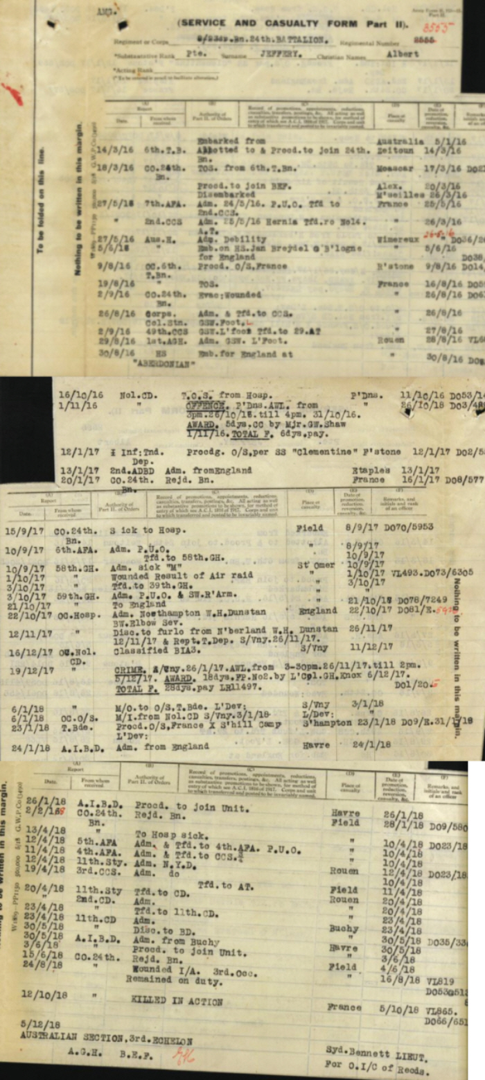 (The title Australian Imperial Forces was only on headstones and memorials, it was not a badge. The badge is worded Australian Commonwealth Military Forces) On line it is possible to see, from the Australian archives, 66 pages of Albert's service records and correspondence between his wife and the Army. Briefly though, he enlisted in the A.I.F on 4th September 1915, in Melbourne, Victoria, giving his age as 26 1/2 , weighing 150 lbs (68.3 kg)and 5' 6 3/4 " (169.5 cm) tall, and he was still unmarried. His wife writes several times from "Denbies", Glenhuntly Road, Glenhuntly, Melbourne. A change of address was notified as Next of Kin, Mrs A.R.Jeffery, c/o Mrs Angus, "St Leonards" Eskdale Road, Caulfield, Melbourne. but so far no actual date for marriage. From the letters it was certainly before September 1916. When writing to ask where Albert's watch and chain were, she mentions the ring she gave him on their marriage six weeks before he sailed, so that puts the marriage at around end of November 1915. He sailed from Australia for Europe on 5th January 1916, via Alexandria and Marseilles. Below is one set of his records. click here to go to the Australian Archives website for full digital scan of his records His was a traumatic life, 2 periods of punishment for being absent without leave, three times ill in hospital and being three times wounded in action, indeed he was wounded whilst in hospital in St Omer on 1st October 1917 by a German air raid. Many times he ended up recuperating in England before being shipped back to his unit. He was killed in action somewhere near Montbrehain, where the 24th Battalion incurred quite heavy losses on 5th October attack. His wife refers to him as being "C" Coy stretcher bearer.The attack of the previous day was the scene for the last Australian VC of the war, Lt. George Morby Ingram V.C. The CWGC date of death is 5th October, his Australian Army service records give 12th October? Initially he was buried with 12 of his mates who were also killed on 5th October, at MELBOURNE CEMETERY, MONTBREHAIN, on the South side of the Montbrehain- Ramicourt road, containing the graves of 15 Australian soldiers (13 of whom belonged to the 24th Battalion, from Victoria,) who fell on the 5th October, 1918. .They were later exhumed and moved to the Bellicourt British Cemetery, a short distance away Some of the abbreviations used in the records are: N.Y.D.....Not yet diagnosed........................ P.U.O.....Pryrexia (fever) of Unknown Origin, both of which are probably medicalese for No Idea. A.F.A.....Australian Field Ambulance............... C.C.S.....Casualty Clearing Station H.S.......Hospital Ship............................ GSW.......Gunshot Wound, similarly B.W. Bullet Wound A.G.H.....Army General Hospital......or Sty...Staionary Hospital.............. M/I and M/O...Marched In or Marched Out . |