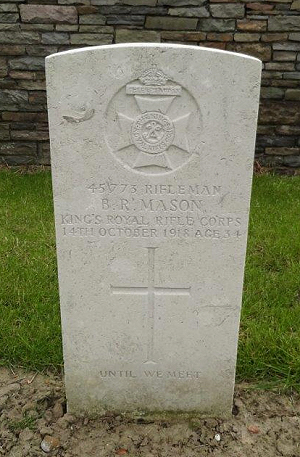 He enlisted in Newmarket 2/15th (County of London) Battalion (Prince of Wales's Own Civil Service Rifles) were formed at Somerset House in September 1914. They went to France in June 1918 and became part of 90th Brigade in 30th Division. A fresh offensive was begun on the 14th from Dixmude to Comines, and within a few days the Allies had taken Courtrai, Roulers and Ostend. from the war diary: It was announced on the 13th that a full attack was to be made the following morning. The London Scottish were to be in the centre, the Civil Service Rifles were to assault on the right, with the 7th Cheshires on their left. London Scottish were to mop up in support of the advancing companies. The objective was the Menin-Wervicq Road some 2,400 yards ahead. A creeping barrage was to begin 300 yards ahead and lift 100 yards every 90 seconds. At the fifteenth lift the barrage was to remain stationary for 15 minutes to enable consolidation then it would continue until it was 200 yards ahead of the objective. Machine guns would provide overhead fire and the heavy artillery would engage targets in the rear. This tactic was proving to be very successful by this stage of the war. The attack was scheduled for 5.35 am and the men were moved up at 4am and all was reported ready. At 4.10 the men moved up to the jump off line which had been marked out with crossed tapes by the Royal Engineers the night before. At 5.35am hundreds of shells passed overhead and the men moved forward. The rain stopped and with 5 percent of the shells being smoke, the men were offered some protection as they moved forward. The German outposts capitulated at once but machine guns positioned behind them showed more fight and serious casualties began to be taken. The wire was sporadic causing some pausing in the advance. On reaching a wooded area they encountered some pillboxes some of which surrendered at once, others held out. Six of Basil's battalion were killed, all bar one buried in Somer Farm Cemetery. |