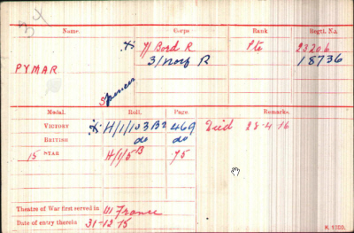 His records have survived albeit many pages are un-readable On February 1st 1915 he enlisted in the Norfolk Regiment, giving his age as 19 years, occupation as grocer and address at ? Farm, Seething, Norfolk. He was 5' 8" ( 172.7 cm) tall, chest 32" to 34" (81.3 to 86.4 cm). On his next of kin page he has crossed out father and replaced with mother and the address was Soham Stud, Newmarket, Suffolk. From the 3rd Battalion, Norfolk Regiment he was transferred to the 10th Battalion Border Regiment on 9th November 1915, being posted to France on 30th December 1915 (just in time to qualify for .the 1914-15 Star). There is nothing legible on line then until the notice to inform his relatives that he was seriously ill in General Hospital, St. Omer, dated 5th April 1916. This was followed by the notice of his death at 1050 a.m. on 28th April 1916 at St Omer, General Hospital from Cerebrospinal Fever. There follows a paper chase to find out where to send his effects, his mother's address being Mrs Minnie B Pymar, c/o Miss Birds, 14 Trafford Road, Norwich on 25th July 1916, cancelled out by a letter on 4th September 1919 to Mrs Minnie B. Pymar at 28 Victoria Street, Norwich. That was followed by a letter to Mrs Minnie Pymar at Soham Street, Newmarket, Suffolk, so they could send his death plaque and scroll. This appears to have been unsuccessful as on 27 May 1920 a further letter was sent to Victoria Street, Norwich and this time she replied that she was indeed still there. Mysteriously there are two pages, one regarding 23260 Private Spencer Llewelyn Hugh Spencer of the Border Regiment asking for any discharge papers as he "was killed in action" and a reply simply stated SLH Pymar was "dead". These however are both dated May 1938, so unless the date stamp had been set up wrongly, a further mystery exists. |