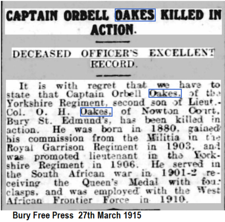 1881 census...not found, still in India ? 1891 census....Aged 10 (recorded as Isbell -daughter) he was at 101 Albert Road East, Glasgow, with his father Ethell[sic] H Oakes [39] Major Worcestershire Regiment; his mother Laura E.B. [34]; brothers Henry J.L. [11] born E Indies and George C [1]; sisters Marion [8]born E Indies, Laura Eva [7] Maud T [5] both born Ireland and Gladys M [3].The Scottish census writing is almost uncypherable, hence many typos] 1901 census...Aged 20, a lieutenant in the militia, he was at Nowton Court with his mother Laura [44]; born Freemantle, Australia; brother Robert Claude[3] born Plymouth; sisters Eva [17] and Maud [15] both born Curragh Camp, Kildare, Gladys [13] and Vera [8] both born Glasgow, Beryl [5] born Plymouth. A brother had been born in Glasgow on November 7th 1899 (reported in Belfast Newsletter) 1911 census...Aged 30 Lieutenant in West African Frontier Force. His parents, brother Robert and sisters Gladys Mary, Vera Albinia and Beryl Mignon were at Nowton Hall. His brother Henry James Lionel Oates born in India on 30th April 1879. He went to Rugby School and was in the Militia - 3rd Infantry Battalion Loyal North Lancaster Regiment in 1898 before joining the Duke of Wellington's West Riding Regiment in May 1899 aged 20 years old as a 2nd Lt. He was posted to the 2nd Battalion to be sent to Burma but just before leaving he transferred to the 1st Battalion and was sent to South Africa landing on 20th Jan 1900 at Cape Town. He was made a Lt on 25th Feb 1900 and was wounded in action on 29th Nov 1900 at Rhenoster Kop when the regiment lost its commanding officer Lt Col Lloyd was killed. He was mentioned in dispatches in the LG 10th Sept 1901 and as a result of his wounds went on half pay 15th July 1902 and retired on 15th July 1907 and was retired at least till April 1920 as he took no part in WW1 due to his injuries. He gained the Queens South Africa Medal with clasps for Cape Colony, Orange Free State, Tranvaal, South Africa 1901 Very much a military family, one has to be careful with identification during the Boer War as his father was there, also named Orbell, but he was commissioned whereas Orbell junior at that time was not. His brother Robert was killed in aerial combat in 1916 see here His nephew John Plampin Oakes was killed in Italy in 1944 see here |