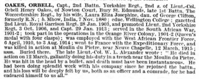 attacks were launched by the enemy and on March 12th Captain Orbell Oakes was killed in action close to Moulin du Pietre at Neuve Chapelle
