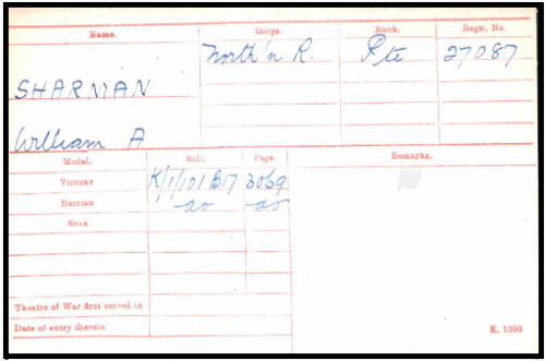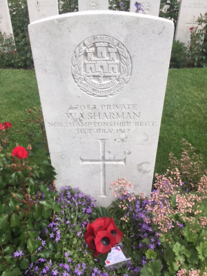 Albert William Sherman was born in Steeple Bumpstead (Risbridge Q2-1890 4A:639), son of Emma SHERMAN. In civil records he can appear as Albert William, in military records he is William Albert. His family name varies from Sharman to Sherman and Shearman. He is SHERMAN on the memorial. 1891 census...Albert William SHEARMAN, aged 1, was at Endway, Steeple Bumpstead with his grandfather Charles SHEARMAN [44] a sawyer; his grandmother Sophia [45]; his mother ? Emma [21]; uncles Daniel [18] and Reuben [15] farm labourers and aunt Louie [8].All were born in Steeple Bumpstead. Emma Sharman married John COOTE in 1899 1901 census...William SHERMAN, aged 11, was at Churchfield, Steeple Bumpstead with his grandparents (now SHERMAN), uncle Reuben and aunt Louie. His mother and stepfather John COOTE [41] farm labourer and their daughter Agnes were at Endway, Steeple Bumpstead with Albert's sister Alice SHERMAN [7] and brother Sydney SHERMAN[3] 1911 census...William SHERMAN, aged 21 a labourer, he was at Churchfield still, with his grandparents. His brother and sister are with their mother and stepfather at Endway and are using the surname COOTE. In 1913 he married Edith Ada STOCK [14-9-1889]. Their son, Gordon William SHARMAN was born on 3-7-1915. The address was Bartlow Road, Castle Camps. She remarried in 1918 to Edward PETTIT |