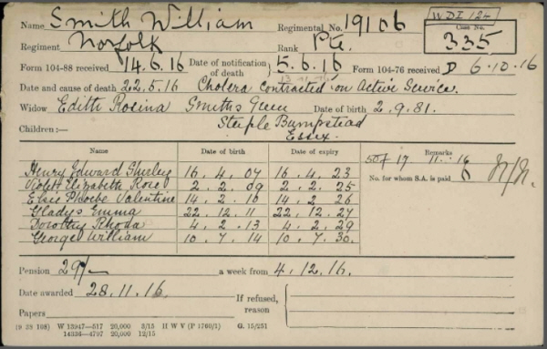 After the surrender of Kut in April, the remainder of the 2nd Battalon formed a composite battalion with the Dorsetshires until new arrivals enabled the re-formation of the 2nd Norfolks in July. Which probably why a war diary cannot be found. As the penson card records, William died of cholera. Disease was killing more men than enemy action |