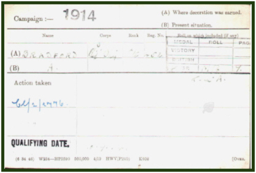 Baptised in Dullingham on 5th August 1894, date of birth given as 18th March 1894, illegitimate son of Ada BROWN. He was admitted to Dullingham School on 10th May 1897 his guardian named as Ada BROWN, leaving on 26th April 1907 (address given as Newton) when leaving the village, now his guardian seems to be Ada BRADFORD (which was changed back to BROWN for the 1901 census). 1901 census...Aged 7, Amos BROWN was at Workhouse, Brinkley Road, Dullingham with his mother Ada BROWN,[25] single, firewood maker; sister Ella BROWN [4] and brother William BROWN [1]. Head of family was his widowed grandmother Eliza BROWN [67] firewood maker and uncle James BROWN [25] builder's labourer. All were born in Dullingham. 1911 census...As Amos BRADFORD, aged 17, a farm labourer, he was at High Street, Stetchworth, a boarder with his stepfather William MARSH and Ada MARSH (his mother) and their five children. In the CWGC records, "Soldier's Personal Effects" and pension card, he is given as the son of Mrs Ada Marsh of Ley Road, Stetchworth. |