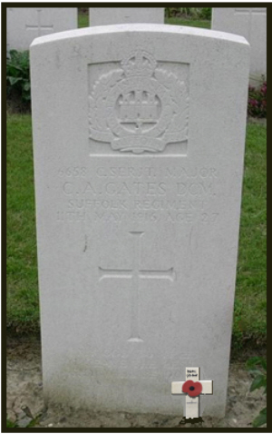 He enlisted in Bury St Edmunds. The citation for his Distinguished Conduct Medal reads: 6658 C.S.M. C. Gates 2nd Bn, For conspicuous devotion to duty throughout the campaign, notably at Le Cateau, where he showed great gallantry in fetching ammunition. (30.6.15) In addition he was awarded the Cross of St George by Russia (the right hand medal above) In "The History of the Suffolk Regiment" by Lt.Col. CCR Murphy it is recorded that :- The 2nd battalion, still in the Vierstraat area in April, were left to hold the brigade front opposite Wytschaete Ridge, on the edge of the storm raging around Ypres. This they continued to do with only inter company relief until they returned to La Clytte toward the end of May....On May 11th CSM C.A. Gates D.C.M. and Cross of St.George was killed by a shell outside of the HQ dugout. C.S.M. Gates was one of the heroes of Mons and Le Cateau, and as cool and gallant a solder as ever served the King. |