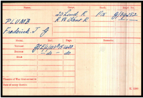 Frederick Joseph George Plumb, born in Six Mile Bottom in 1896 (Newmarket Q4-1896 3B:522), baptised in Westley Waterless on 4th June 1899, son of Frederick and Elizabeth Sarah PLUMB (née WEBB). In two census his place of birth is given as Westley Waterless.