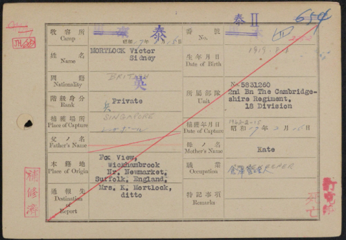 Victor was captured at the surrender of Singapore on 15th February 1942. The 2nd Cambridgeshires were fighting until the end,