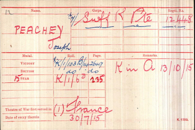 1901 census...Aged 5, he was in Saxon Street with his father James PEACHEY [40], a bricklayer; his mother Harriet [39]; brother Reuben [15] a farm labourer; brothers Stanley [8] and Robert [3] and sister Hannah [1]. The whole family were born in Woodditton (Saxon Street). Sister Eliza Ruth Emmeline was staying with her uncle Thomas BURLING in Saxon Street. 1911 census... Aged 15, a farm labourer, he was in Saxon Street with his widower father, brothers Frank Reuben (labourer), sister Eliza Ruth Emmeline [22], brother Stanley (farm labourer), brother Robert (butcher's help), sister Hannah and brother Richard [8]. Now the whole family are recorded as born in Saxon Street. His mother had died in 1906. His father died in 1918. |