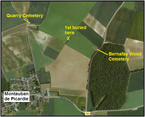 He enlisted in Newmarket. The 8th Suffolks had been engaged in an attack at Delville Wood on 18/19 July. It was their first experience of open warfare. Advancing across open countryside in broad daylight against well placed German machine guns brought about heavy casualties,but eventually the line in the village was advanced 300 yards and the bottle neck entrance to Delvllle Wood widened. The position was then consolidated and on the morning of the 21st they were relieved. The 19th July saw 19 killed, and on the 20th a further 9 died, one of them, Thomas Williamson, also named on the Woodditton memorial. Percy was initially buried in QUARRY SCOTTISH CEMETERY, MONTAUBAN (see below) but the 55 graves here were concentrated in 1919 to Quarry Cemetery |